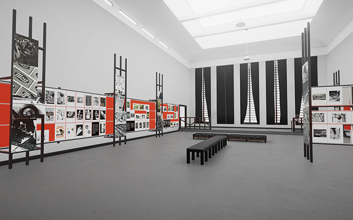 Besides parts of the original Berlin exhibition being physically reproduced as a set in the NRW-Forum, our VR installation aims to create an experience that is as true to the original material as possible. In the creation process, we rebuilt the original room in Blender and recreated every detail we had access to such as the soft, cozy benches. In Unity, we used self-made PBR materials to recreate the concrete floor, bright plaster walls and metal frameworks. We also developed tools to place, scale and rotate the hundreds of photographs on the walls, and to add passepartouts. If you are planning to do a similar project give us a wink.